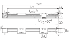 • L2 = 總行程 + 2 x L + 12 + Lmin L tot = 總行程 + 2 x L + 2 x L4 + 12 + Lmin 總行程 = 2 有效行程+ 2 x S (有效行程/滑塊單位: mm) 注意:允差S指一個安全范圍,至少應為85 mm。 最大支撐軌長度 L2 = 8000 mm。