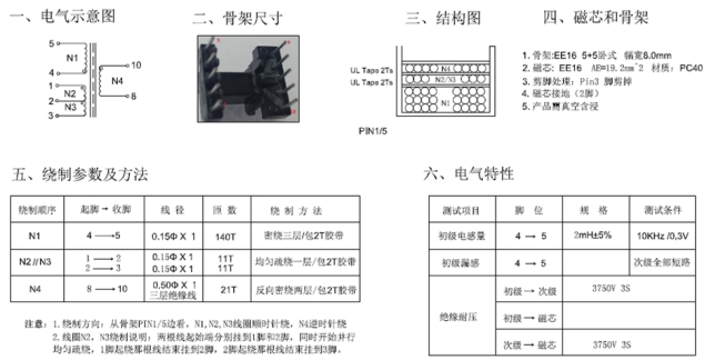 變壓器作為電源適配器中的關(guān)鍵部件,其性能直接影響電源轉(zhuǎn)換效率與輸出穩(wěn)定性。該適配器采用 EE16 型號(hào)的變壓器,初級(jí)與次級(jí)繞組匝數(shù)比為 140:21,電感量設(shè)定為 2mH,磁芯有效截面積為 19.2mm2。