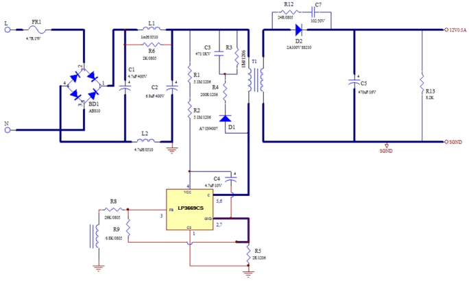 該電源適配器的電路設(shè)計(jì)遵循典型的開關(guān)電源架構(gòu),通過 LP3669CS 芯片實(shí)現(xiàn)精準(zhǔn)的電壓與電流控制,搭配 SS210 二極管完成高效的整流任務(wù)。輸入端接入 90-265VAC 的寬電壓范圍交流電,經(jīng)由整流橋轉(zhuǎn)換為脈動(dòng)直流電,隨后進(jìn)入由 LP3669CS 控制的開關(guān)變換環(huán)節(jié)。