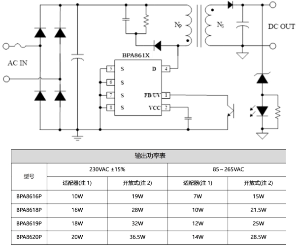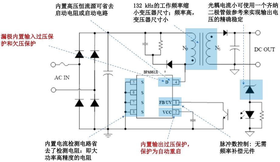 在設計細節(jié)上,BPA861X 也展現(xiàn)出了諸多優(yōu)化之處。它內(nèi)置了高壓恒流源,可以省去啟動電阻或啟動電路,簡化了外圍電路設計,降低了成本。同時,BPA861X 還內(nèi)置了電流檢測電路,省去了檢測電阻,這不僅減少了外圍元件數(shù)量,還提高了檢測精度和可靠性。相比之下,友商產(chǎn)品在這些方面往往需要額外的外圍元件來實現(xiàn)相同的功能,這不僅增加了設計復雜度和成本,還可能因元件數(shù)量的增加而降低系統(tǒng)的可靠性。