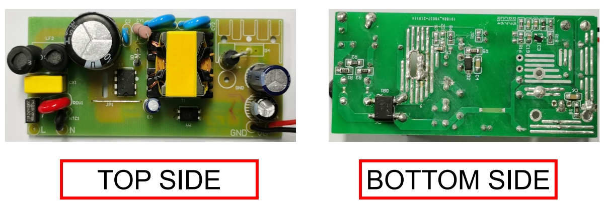 在電路板的正面,主要布置了輸入端的整流橋 DB1、電解電容 E1 以及變壓器 T1 等元件,這些元件的布局充分考慮了電流路徑的合理性,減少了線路阻抗,降低了功耗和發(fā)熱。
