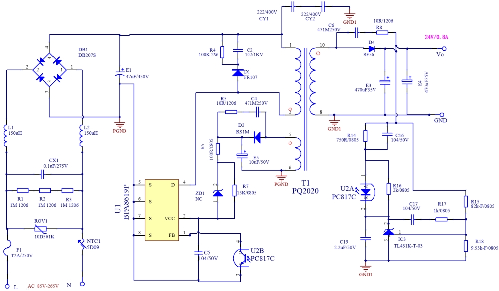 BPA8619P 的電路圖是整個電源方案的核心,它詳細(xì)展示了電源電路的各個組成部分以及它們之間的連接關(guān)系。從電路圖中可以看出,該電源采用了典型的反激式開關(guān)電源拓?fù)浣Y(jié)構(gòu),這種結(jié)構(gòu)具有電路簡單、成本較低、易于實現(xiàn)等優(yōu)點,同時也能滿足較高的性能要求。