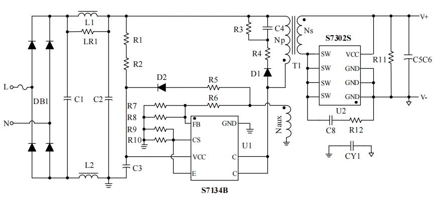 S7134B芯片的電路原理圖是其參考設(shè)計的核心部分,它詳細展示了芯片如何與其他電子元件協(xié)同工作,以實現(xiàn)恒壓恒流的電源輸出。以下是電路原理圖的簡要說明:
