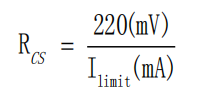 Rcs電阻的選擇需綜合考慮負載電流和電感電流紋波,并留有余量。由于內部比較器延遲,實際CS_TH略高于芯片內部200mV基準電壓。CS電阻計算公式為: