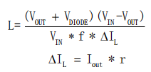 BP2522D可工作于連續導通模式(CCM)、不連續導通模式(DCM)等多種模式。電感選擇需綜合考慮感量、峰值電流和平均電流。小感量電感能減小尺寸、降低成本并改善動態響應,但會增大峰值電流和輸出紋波,降低系統效率。大感量電感可提高效率,但尺寸較大,動態響應較慢。實際應用中,需綜合考慮動態響應、電感尺寸、效率、實際帶載電流和芯片溫升等因素,選擇合適的電感。電感計算公式為: