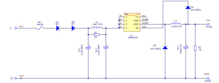 在智能家居、小家電、MCU待機(jī)供電等超小功率場景中,非隔離輔助電源因成本低、體積小、設(shè)計簡單而備受青睞。過去,OB2222E曾是這類100mA級方案的主流選擇,但受限于交期、價格及EMI裕量,工程師急需一顆直接替換、性能更優(yōu)的新品。BP8593D以 SOP7封裝、內(nèi)置700V MOS、PSR架構(gòu)、<100mW待機(jī)功耗為核心賣點,官方參考設(shè)計5V/100mA已完整驗證,BOM、PCB、測試數(shù)據(jù)一步到位,可實現(xiàn)零調(diào)試替代OB2222E。本文帶你一圖看懂這顆“小鋼炮”。