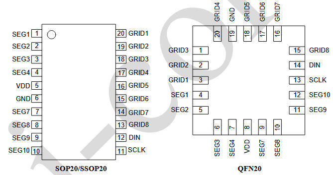 | 13-20 | GRID1-8 | O | 位選(共陰),300 mA灌入能力 |