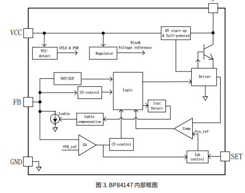 BP84147是晶豐明源(BPS)推出的一款高性能原邊反饋(PSR)恒壓恒流反激變換器控制芯片,采用SOP-8封裝,最大輸出功率18W(90-265VAC全電壓范圍)。該芯片最大的特點是高度集成化設計,通過源極開關拓撲結構實現了極簡外圍電路,非常適合充電器、適配器等成本敏感型應用。