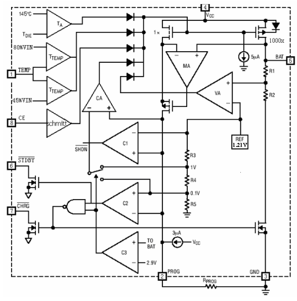 充電電壓被固定在4.2V,充電電流可通過外部電阻設(shè)置。當(dāng)充電電流在達(dá)到最終浮充電壓之后降至設(shè)定值 1/10 時,AP5056 將自動終止充電循環(huán)。當(dāng)輸入端(適配器或USB電源)拔掉后,AP5056自動進(jìn)入低電流狀態(tài),電池漏電流將降到2μA以下。AP5056還可被設(shè)置于停機(jī)狀態(tài),使電源電流降到50μA。其余特性包括:電池溫度監(jiān)測,欠壓鎖閉,自動再充電和兩個狀態(tài)引腳以顯示充電和充電終止。