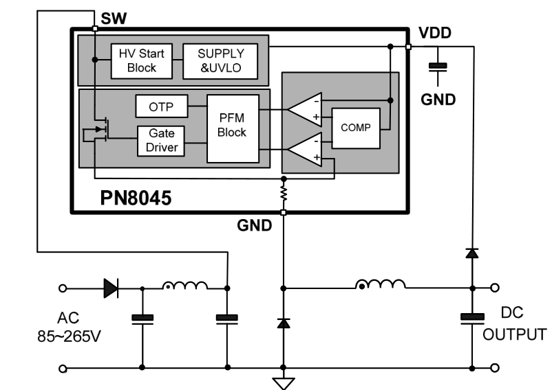 PN8045集成PFM控制器及650V高雪崩能力智能功率MOSFET,用于外圍元器件較簡的小功率非隔離開關(guān)電源。PN8045內(nèi)置啟動模塊,實現(xiàn)系統(tǒng)啟動、待機(jī)功能。該芯片提供了智能化保護(hù)功能,包括過載保護(hù),欠壓保護(hù),過溫保護(hù)。另外PN8045的降頻調(diào)制技術(shù)有助于EMI特性。