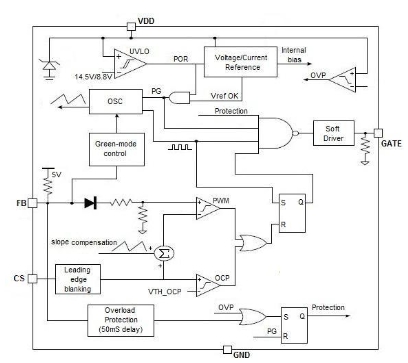 該系列同時提供多種保護功能,主要包括OVP、OCP. OLP等。為了防止外部功率MOS管柵極因高壓損毀,該系列的驅動輸出被鉗位在15V。