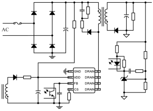 芯片通過對輸出采樣并反饋到光耦獲得高精度的恒壓輸出。內(nèi)置的斜率補償電路確保了峰值電流模控制的穩(wěn)定性。內(nèi)部集成的頻率抖動功能可以改善EMC,降低EMI濾波成本。
