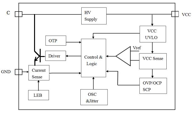 其內(nèi)部集成了高壓功率開關(guān),采用專利電壓電流控制技術(shù),無需外部電壓反饋和電流偵測(cè)電路即可實(shí)現(xiàn)精確的電壓和電流調(diào)節(jié),極大的方便客戶使用。