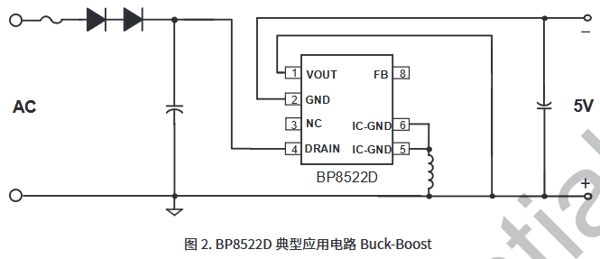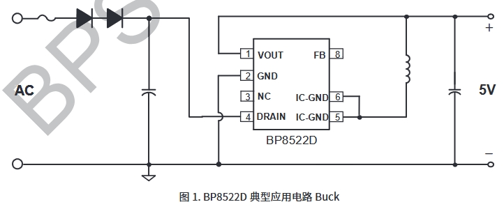 BP8522D內部集成了550V高壓MOSFET、高壓啟動和自供電電路、電流采樣電路、電壓反饋電路以及續流二極管,采用先進的控制技術,無需外部VCC電容和環路補償即可實現優異的恒壓輸出特性,極大地減少了外圍器件數量,節省了系統成本和體積,同時提高了可靠性。