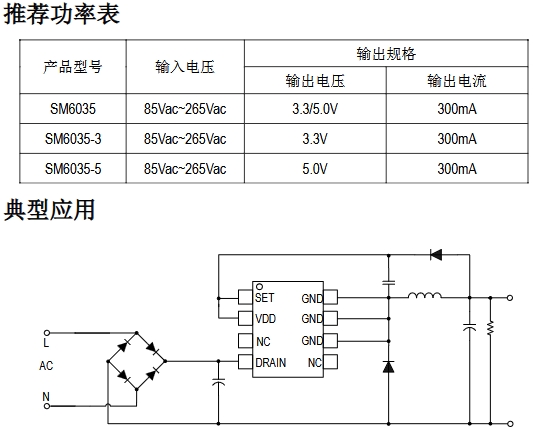 SM6035-X 是一款高精度非隔離、高集成度且低成本的降壓恒壓控制芯片,適用于 85Vac~265Vac 全電壓范圍應(yīng)用;SM6035-X 內(nèi)部集成500V高壓功率管,內(nèi)置 CS 電阻,無(wú)需外部補(bǔ)償元件,即可實(shí)現(xiàn)優(yōu)異的線(xiàn)性調(diào)整率和負(fù)載調(diào)整率,外圍元件極少,大大的降低了系統(tǒng)的成本,節(jié)約了PCB的尺寸。SM6035-X 應(yīng)用于多種供電電源領(lǐng)域,提供3.3/5V 兩種規(guī)格輸出電壓。同時(shí)芯片集成有完備的保護(hù)功能,過(guò)溫保護(hù)、過(guò)壓保護(hù)、欠壓保護(hù)等,保證了系統(tǒng)的可靠性。