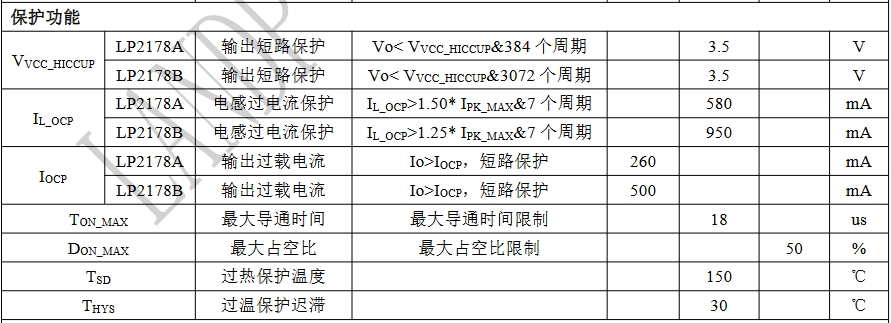 LP2178A和LP2178B均具備多重保護(hù)功能,包括VCC鉗位/欠壓保護(hù)、輸出短路保護(hù)、電感過電流保護(hù)及過溫保護(hù)等。