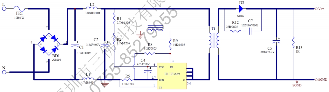 電路設(shè)計(jì):LP3669A適用于雙繞組原邊反饋控制,系統(tǒng)工作于斷續(xù)模式,適用于充電器和適配器以及其他輔助類電源。LP3669A采用特有的輸出線損補(bǔ)償技術(shù),可以有效的補(bǔ)償輸出電流在輸出線上的損耗壓降;恒壓時(shí),采用谷底導(dǎo)通技術(shù),提升恒壓效率。
