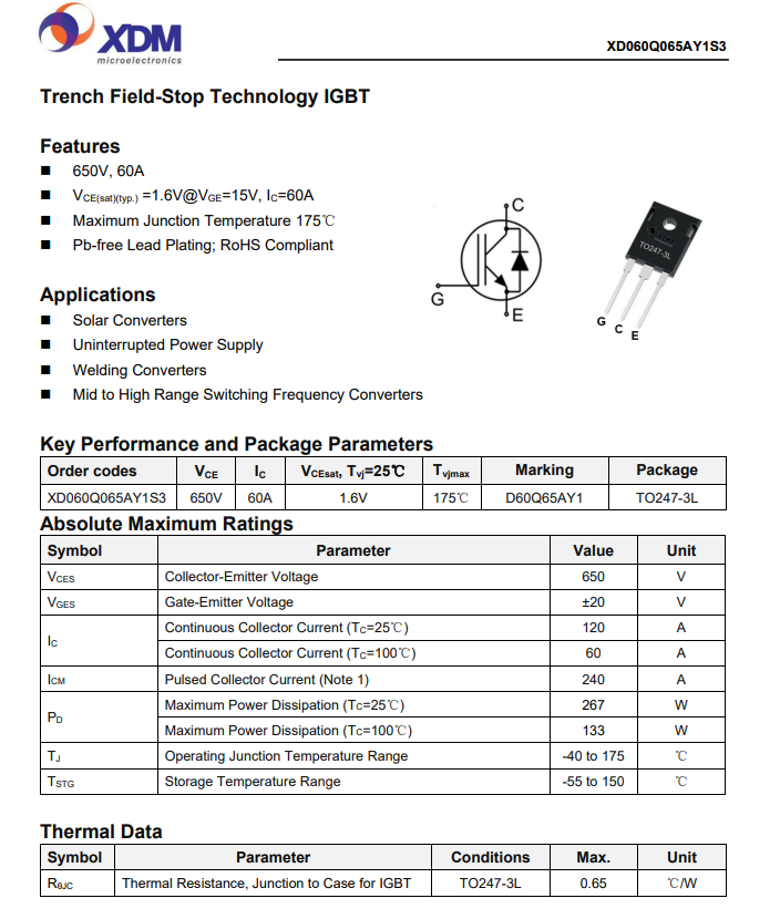XD060Q065AY1S3芯達茂 國產(chǎn)IBGT +FRD單管 60A 650V TO-247-3L