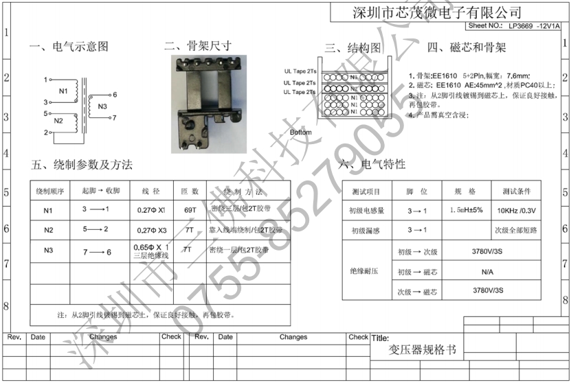 變壓器是電源設計中的核心組件之一,其性能直接影響到電源的效率和穩定性。報告中提供了變壓器的詳細資料,包括尺寸、線圈匝數、磁芯材料等,這些都是評估變壓器性能的關鍵參數。